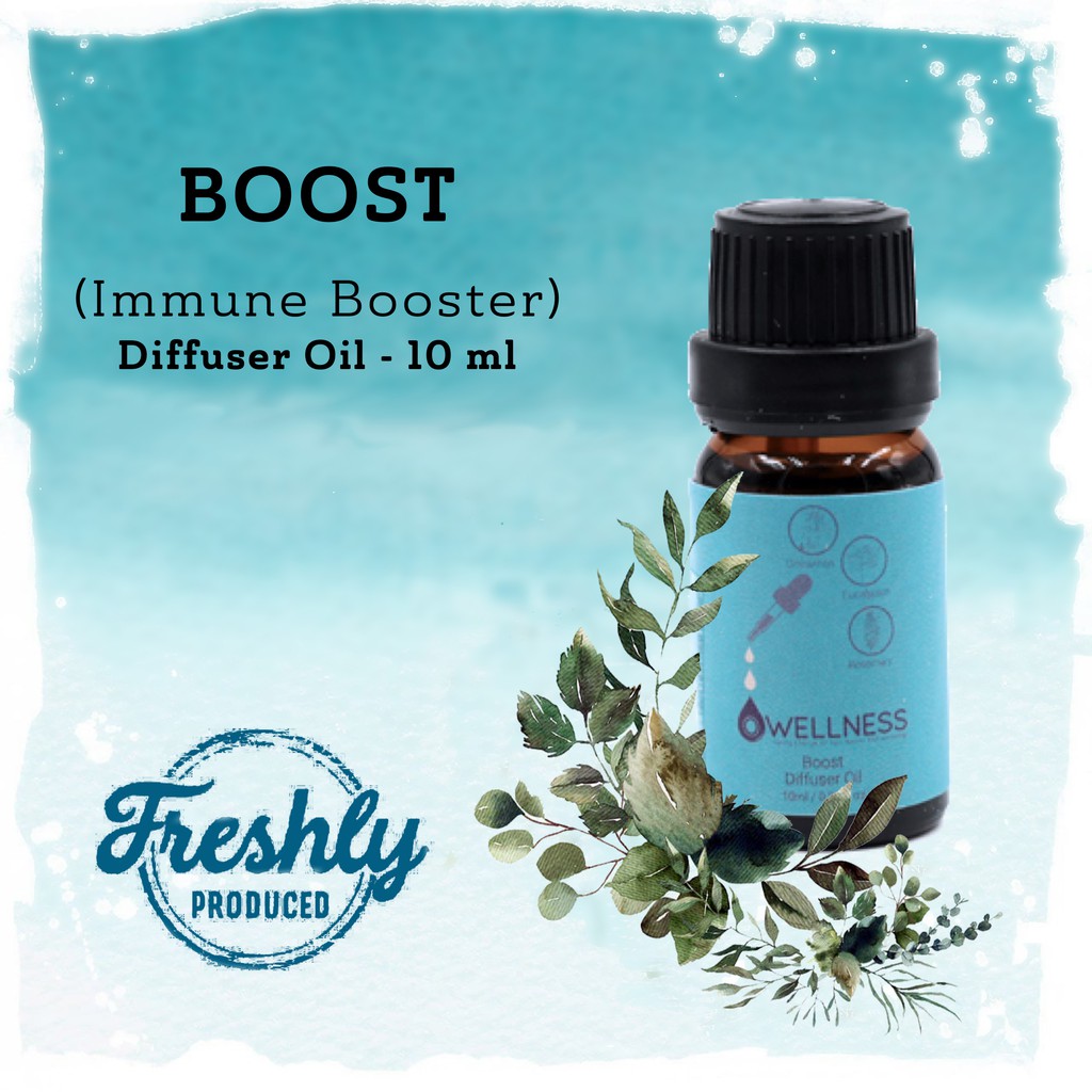 Boost (Anti Virus) Diffuser OilMembantu meningkatkan daya tahan tubuhPerpaduan minyak esensial cengkeh, lemon, kayu manis, eucalyptus, dan rosemary untuk membantu meningkatkan imunitas tubuh.Ingridients: CENGKEH (Eugenia caryophyllata), JERUK LEMON (Citrus limon), KAYU MANIS (Cinnamomum zeylanicum), EUCALYPTUS (Eucalyptus globulus) dan ROSEMARY (Rosmarinus officinalis )Cara pakai: Letakkan diffuser pada area datar. Teteskan 1-3 tetes minyak esensial pada 30 ml air bersih ke dalam diffuser. Atau, teteskan 1-2 tetes minyak pada sapu tangan atau scarf. Hirup aromanya secara perlahan.Boost (Anti Virus) Diffuser OilHelp improve the durability of the bodyA blend of clove, lemon, cinnamon, eucalyptus, and rosemary essential oils to help boost immunity. Ingridients: CLOVE (Eugenia caryophyllata), LEMON (Citrus limon), CINNAMON (Cinnamomum zeylanicum), EUCALYPTUS (Eucalyptus globulus) dan ROSEMARY (Rosmarinus officinalis )Direction: Put the diffuser on a flat surface. Mix 1-3 drops of essential oil in 30ml distilled water into the diffuser. Or, put 1-3 drops of essential oil to the handkerchief or scarf. Breathe in slowly.OWELLNESS #BrandLokal dengan qualitas export yang menggunakan #Therapeutic Grade #EssentialOil dan mendukung kampanye pemerintah #BanggaBuatanIndo