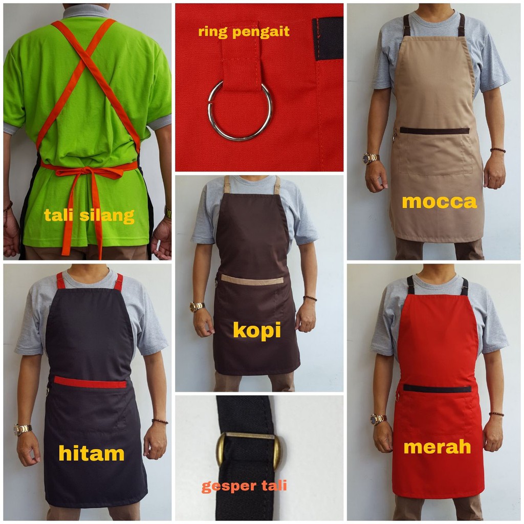 Apron Barista Celemek MasakModel Silang alias X-styleBahan kain American Drill yang bagusnyaPanjang sekitar 83cmLebar sekitar 60cmTali panjang bisa ukuran S sampai XXLTali silang dilengkapi 2 gesper logam sehingga tampil Kece n bisa diatur ukurannya.Dilengkapi saku besar yg dibagi jadi 2 saku kecil n 1 saku besarDilengkapi juga ring untuk pengait semprotan, serbet dll*** Jika perlu memilih warna, tulis sj di catatan beli ato di chat#apron #ce